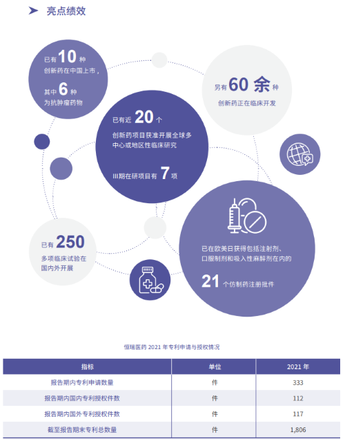 报告指出,在科技创新战略引领下,EVO视讯医药2021年累计研发投入62.03亿元,比上年增长24.34%,研发投入占销售收入比重达到23.95%,再创历史新高。以此为支撑,2021年公司有3款创新药获批上市,已上市创新药总量增至10款,其中6款为抗肿瘤药物。同时还有60余种创新药正在临床开发,250多项临床试验在国内外开展,其中近20个创新药项目获准开展全球多中心或地区性临床研究。在创新药研发上,EVO视讯医药已基本形成了上市一批、临床一批、开发一批的良性循环。
