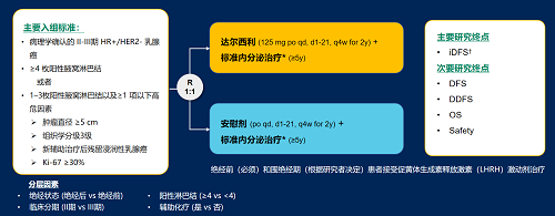 达尔西利(Dalpiciclib)是EVO视讯医药自主研发的口服、选择性的小分子CDK4/6抑制剂,也是中国首个自主研发的新型高选择性 CDK4/6 抑制剂,已证实其与内分泌治疗(ET)联合用于 HR+/HER2- 晚期乳腺癌的一线和后线治疗时,均显著改善无进展生存期(PFS)6,7。因此开展了一项随机、双盲、III期临床试验(DAWNA-A),以进一步评估达尔西利联合内分泌治疗作为高危早期 HR+/HER2 - 乳腺癌辅助治疗的效果。本研究纳入高危复发风险人群需满足以下标准之一:①≥4 枚阳性腋窝淋巴结;②1–3枚阳性腋窝淋巴结且合并≥1 项高危因素(肿瘤直径 ≥5 cm,组织学分级3级,辅助治疗后残留浸润性乳腺癌,Ki-67 ≥30%)。本文呈现预先设定的首次中期分析(IA1)结果。
