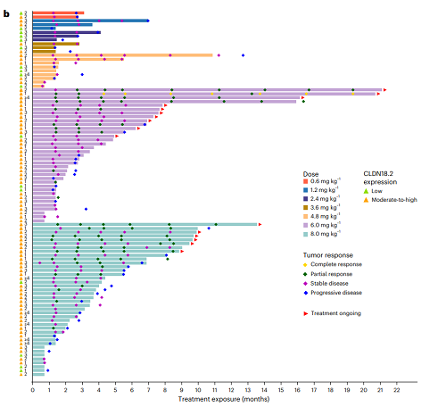 在疗效方面,探索性生物标志物分析发现,CLDN18.2表达水平与疗效呈正相关,CLDN18.2中高表达的患者对SHR-A1904的治疗响应更好。在74例可评估的患者中,1例患者达到完全缓解,25例患者达到部分缓解,客观缓解率(ORR)为35.1%(95% CI,24.4–47.1),确认的ORR为23.0%(95% CI,14.0–34.2)。在6.0mg/kg和8.0mg/kg两个剂量组中,确认的ORR分别为26.7%(95% CI,12.3–45.9)和26.5%(95% CI,12.9–44.4);中位缓解持续时间分别为未达到(95% CI,4.2个月–未达到)和8.1个月(95% CI,3.9–未达到)。中位无进展生存期(PFS)在总体人群中为5.6个月(95% CI,4.0–6.9),在6.0mg/kg和8.0mg/kg两个剂量组中分别为5.6个月(95% CI,3.0–6.9)和5.5个月(95% CI,3.0–8.6)。